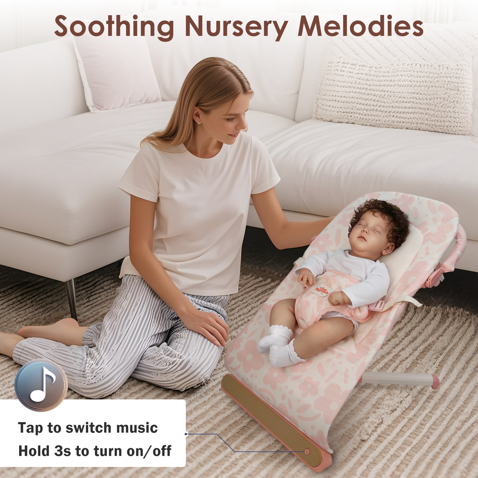 ●Music Function for Added Entertainment: Featuring soothing melodies, this baby bouncer chair has an adjustable music function to create a calming atmosphere. You can easily switch between low or high volume to suit your baby’s mood.
